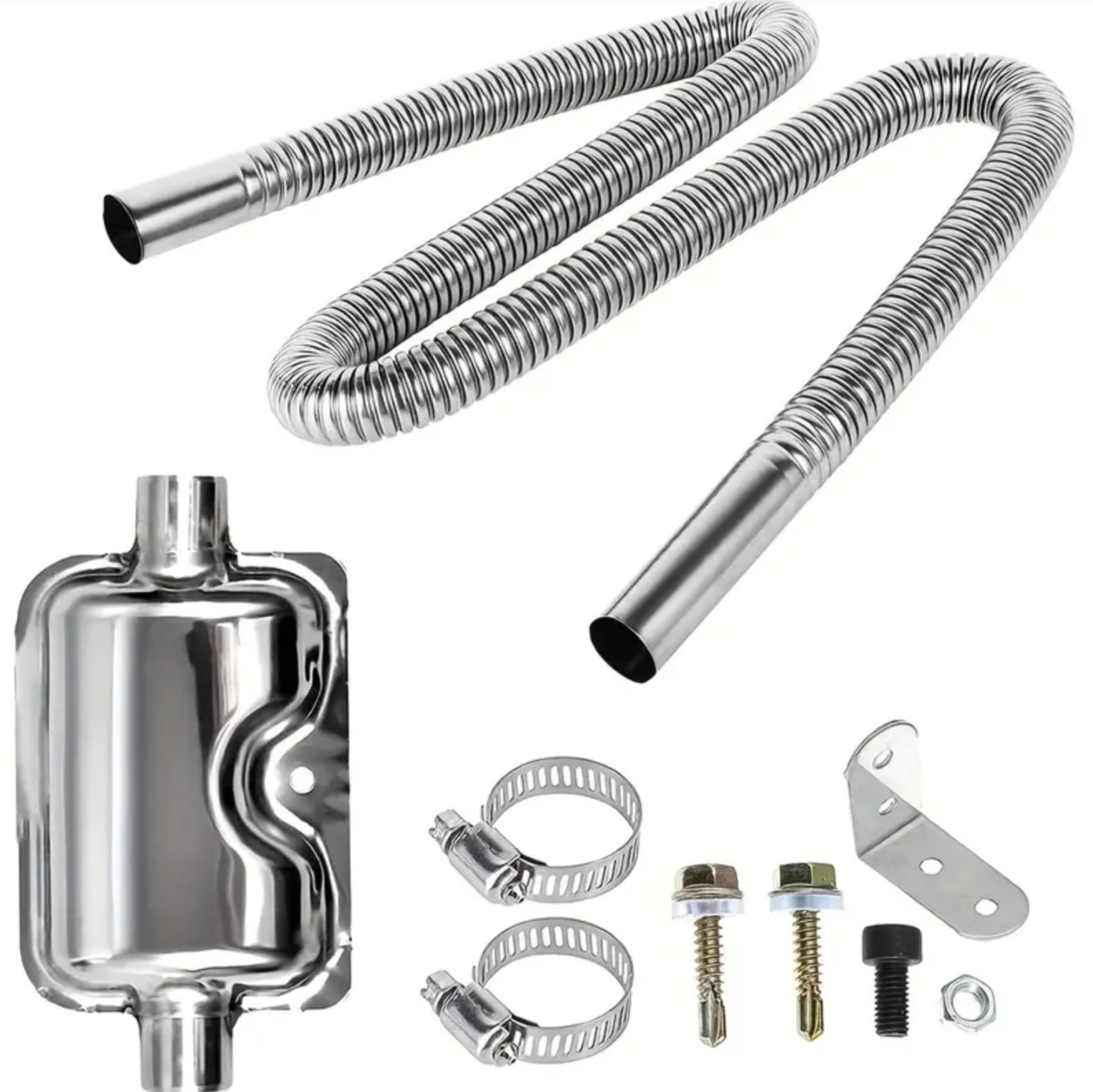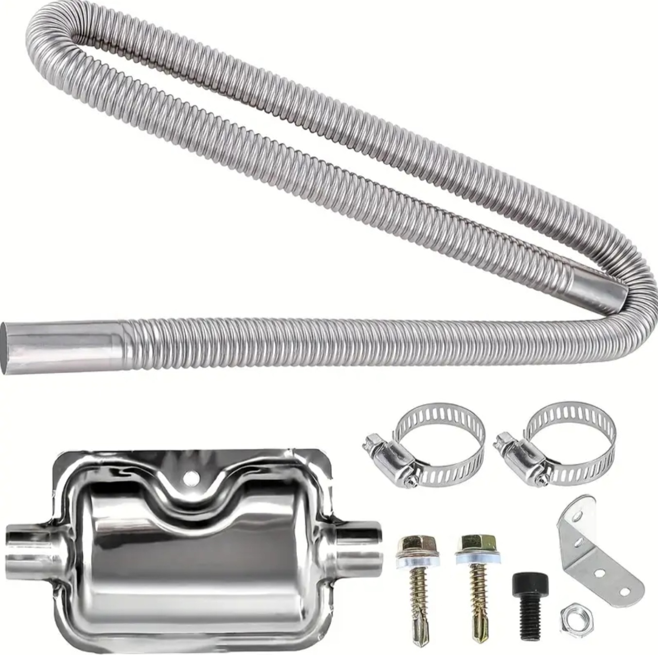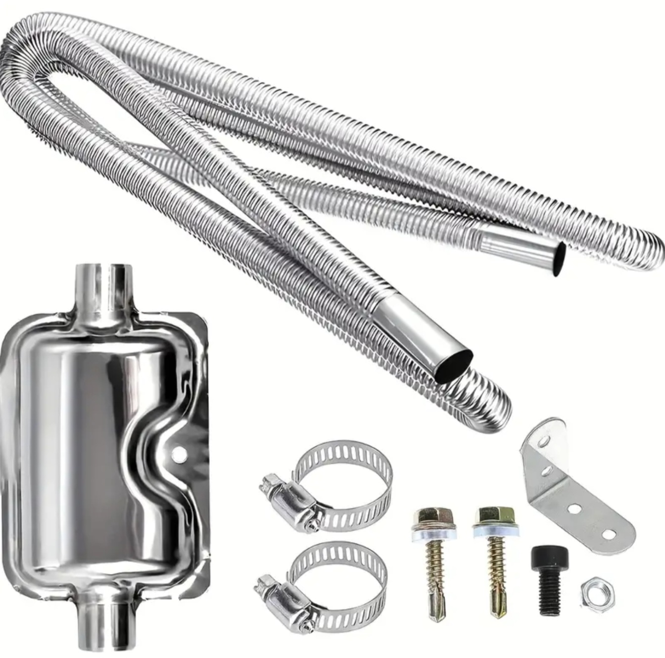 Ez a készlet a hordozható dízel légfűtők (mint a VEVOR vagy Sunster modellek) égéstermékeinek elvezetésére szolgál. A rozsdamentes acélból készült rugalmas kipufogócső és a hangtompító (dob) segít a zajcsökkentésben és a biztonságos kivezetésben.